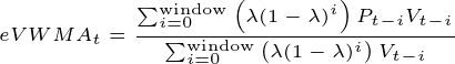 Equation 2.6.1. Elastic Volume Weighted Moving Average (eVWMA) formula illustrating the relationship between price, volume, and an exponential factor over a specified window.
