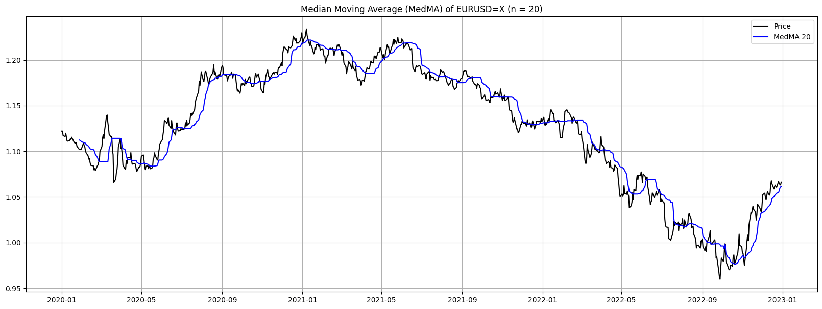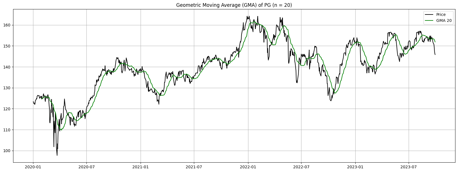 Figure 6. Geometric Moving Average (GMA) of PG (2020–2023): The GMA is calculated by taking the nth root of the product of the previous n days’ closing prices. For this data, we’re using a 20-day window. In the plot, Procter & Gamble’s stock price (black) is displayed alongside its GMA (green). The GMA offers a multiplicative view of returns over the specified window and provides a unique perspective on the price’s general movement, compared to other moving averages.