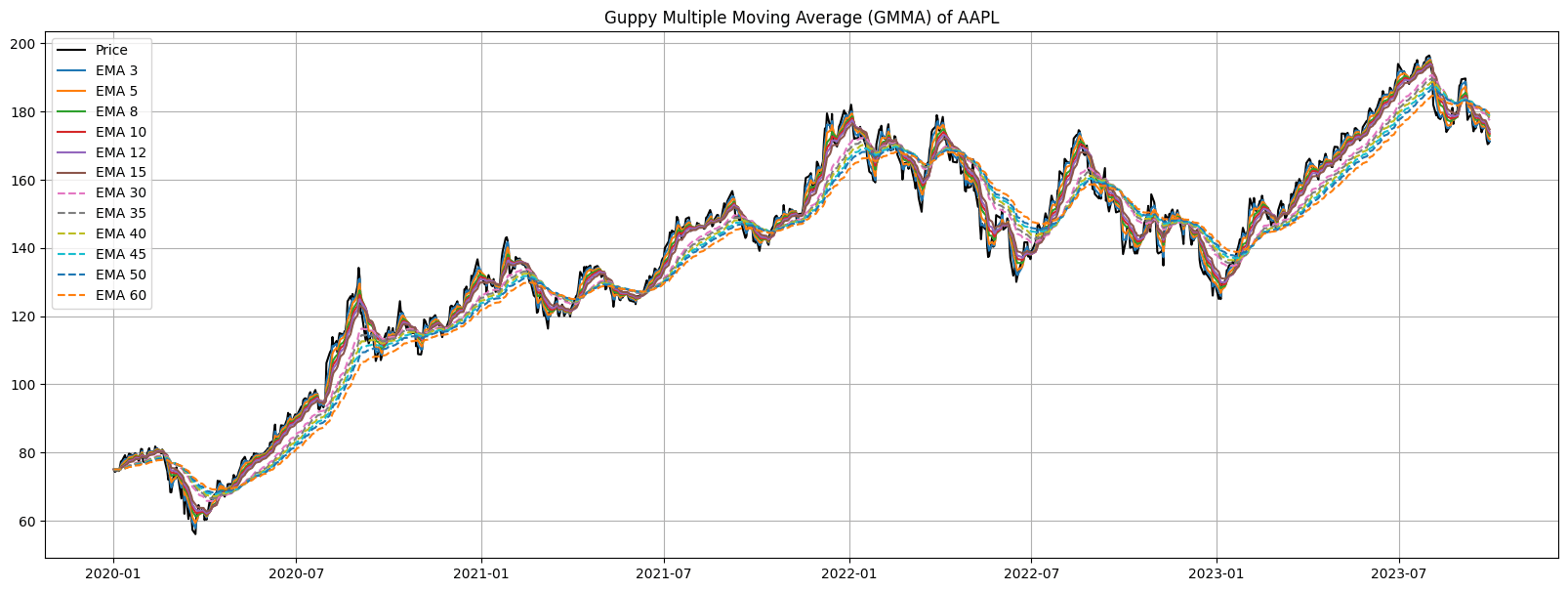 The GMMA is especially useful in determining the strength of a trend. When the short-term group of EMAs moves above the long-term group and both groups diverge, it suggests a strong upward trend. Conversely, when the short-term EMAs move below the long-term group and diverge, it indicates a strong downward trend.
