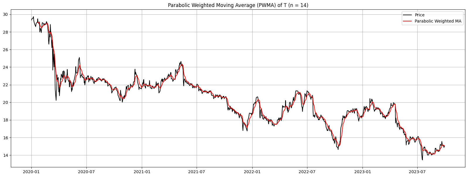 Figure 9. PWMA of T (2020–2023): The PWMA (red) uses a parabolic weighting scheme, giving more emphasis to recent prices in the calculation. Plotted against AT&T’s closing price (black), this method offers a distinct perspective on price trends by weighing recent data more heavily.
