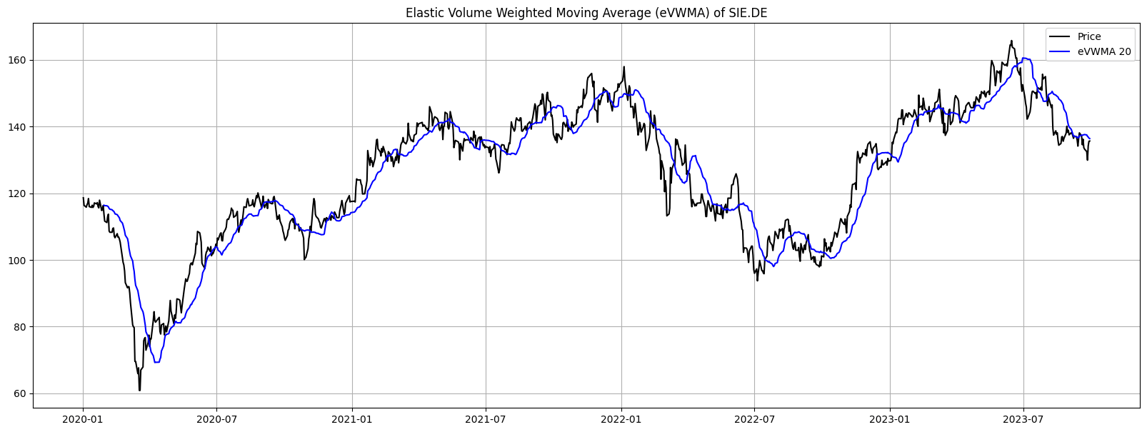 Figure 7. Elastic Volume Weighted Moving Average (eVWMA) of SIE.DE (2020–2023): Using a 20-day window, the eVWMA emphasizes volume’s impact on price. The chart contrasts Siemens AG’s stock price (black) with its eVWMA (blue), offering insight into volume-driven price changes.