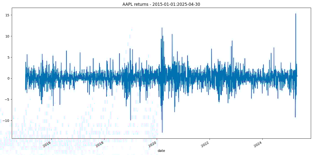 from api_keys import FMP_API_KEYThen, we download the data. For this example, we use Apple’s stock prices from 2015 to April 2025. ARCH models estimate time-varying variance, which is generally more data-hungry than conditional mean models. With too little data, we risk unstable variance estimates and overfitting. Having enough data also helps capture different volatility regimes (for example, crises and quieter periods).