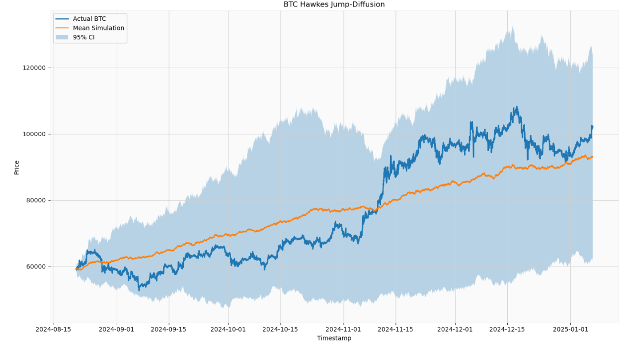 BTC-USD: Hawkes Jump-Diffusion Mean Simulation with 95% CI vs Actual Price