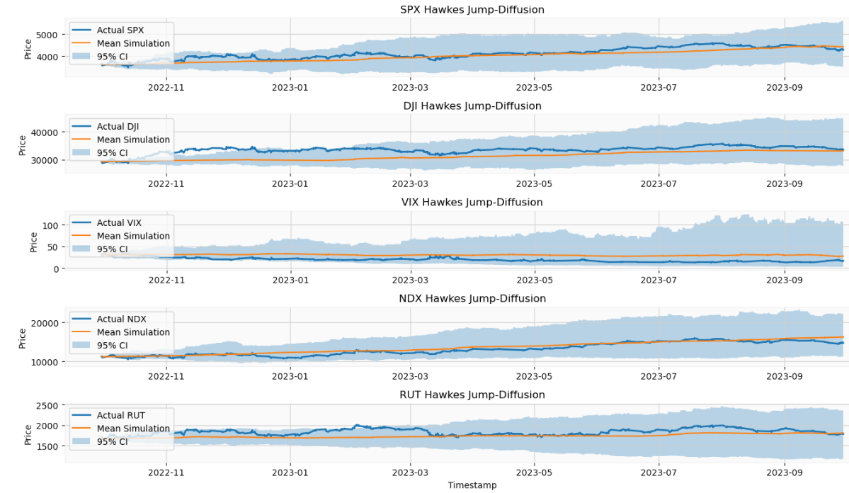 Indices: Hawkes Jump-Diffusion Mean Simulation with 95% CI vs Actual Price