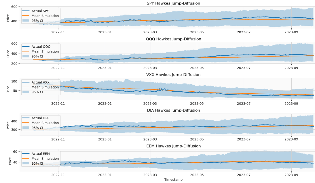 ETFs: Hawkes Jump-Diffusion Mean Simulation with 95% CI vs Actual Price