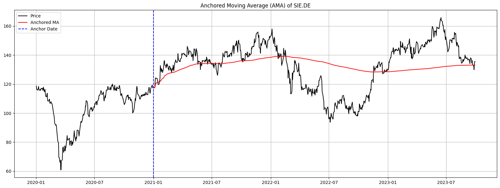 Figure 6. Anchored Moving Average (AMA) of SAP.DE (2020–2023): The AMA begins calculation from a specific ‘anchor’ date, rather than a rolling window. It averages all data from this anchor point to the present. The plot showcases SAP’s stock price (black) juxtaposed with its AMA (red), starting from the blue dashed anchor date. The AMA provides insights into price trends since a significant event or chosen anchor date.