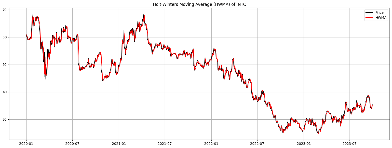 Figure 7. Holt-Winters Moving Average (HWMA) of INTC (2020–2023): The HWMA (red) applies exponential smoothing techniques, considering both trend and seasonality, to depict INTC’s stock price movement. Displayed against the actual closing price (black), it provides insights into the underlying trend and potential seasonality in the stock’s performance.