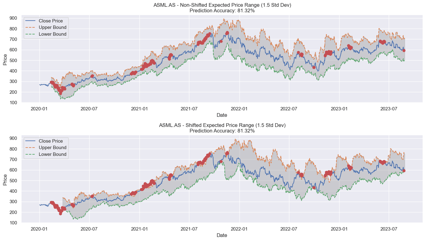 To visualize this, two plots are provided: one with the original bounds and another where the bounds are shifted by our forward period for clarity. Red dots highlight instances where the actual stock price diverged from our predicted range. By counting these deviations, we gauge the prediction accuracy of our model.