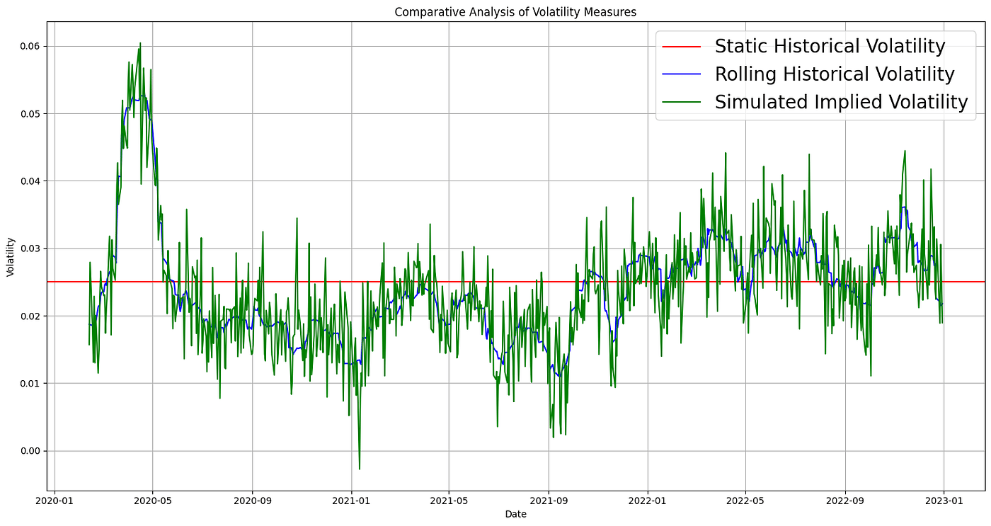 Comparative Analysis of Volatility Measures: A visualization of Static Historical Volatility, Rolling Historical Volatility, and Simulated Implied Volatility over time.