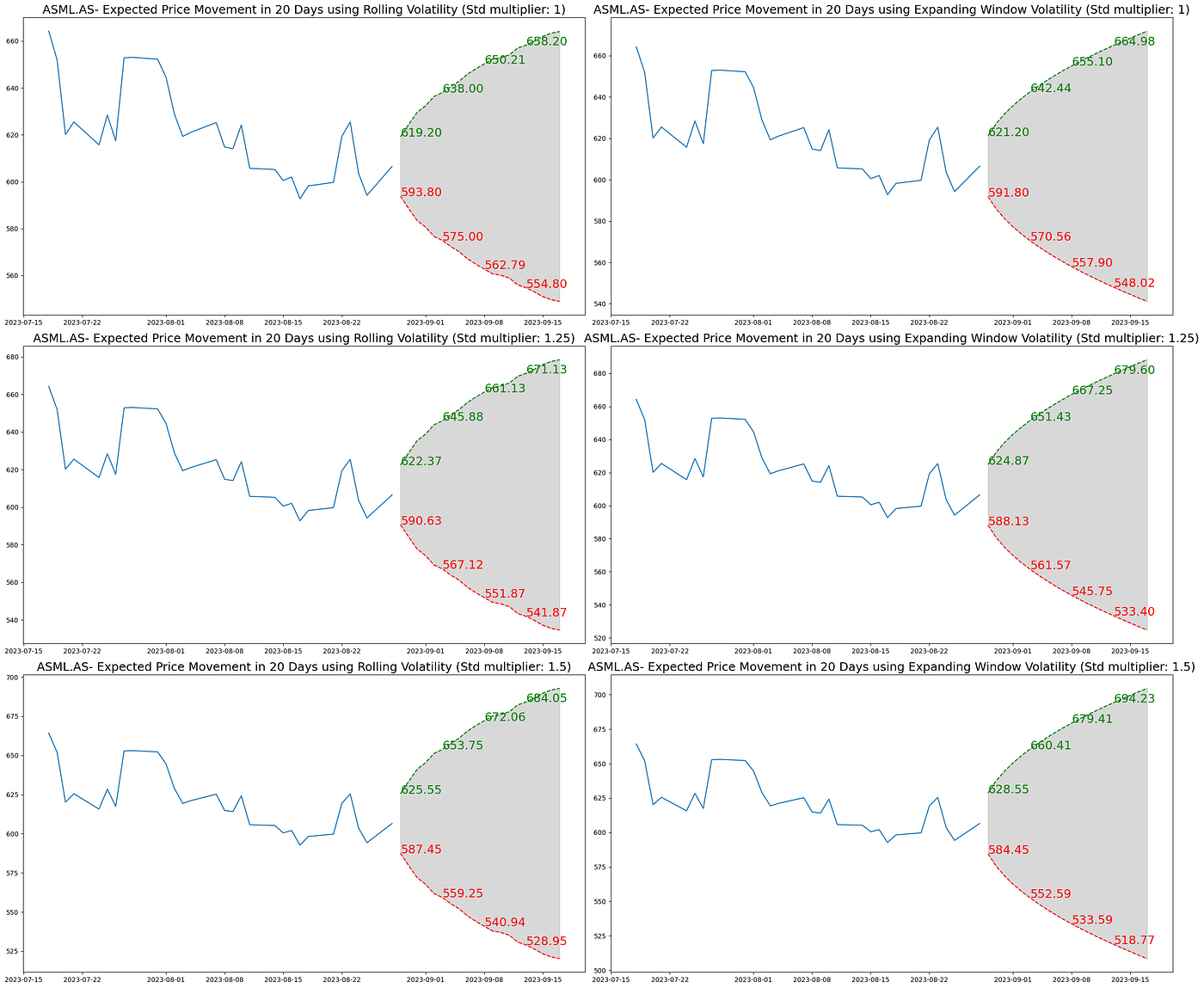 Visualization of Expected Price Movement for ASML.AS Over 20 Days: Cones of Volatility Using Both Rolling and Expanding Window Volatility. Each subplot illustrates potential price trajectories based on different standard deviation multipliers.